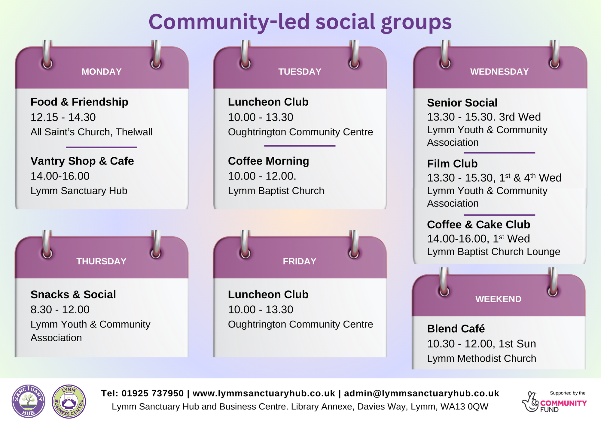 Lymm Sanctuary Hub provides a range of community-led services and activities supporting individuals and families in Lymm, High Legh, Thelwall and Warburton.